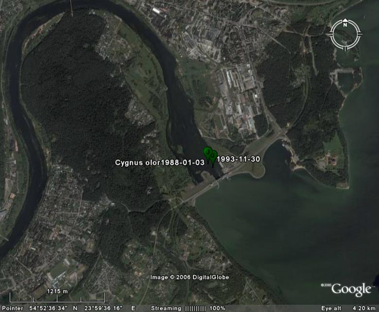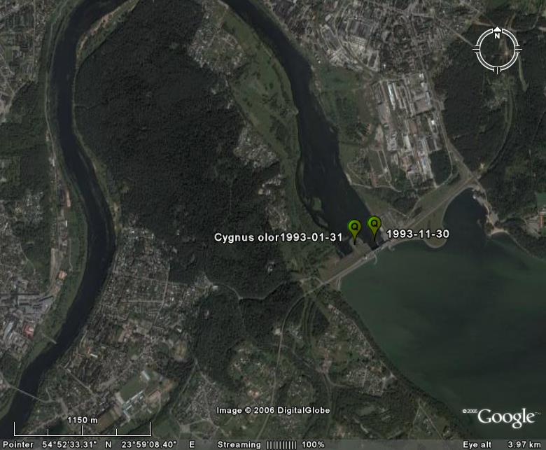 | Cygnus olor | 9152 | 1991 01 15 | Rumšiškės, Kaišiadorys | M | <1990 | 1993 03 09 | Kaunas | Lietuva | Gyvas | 784 | 21 |
