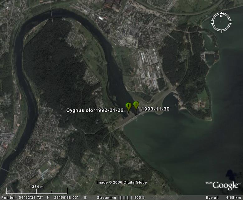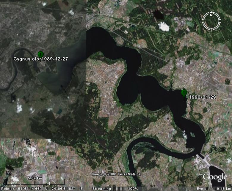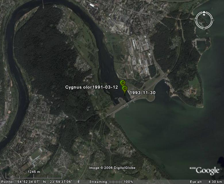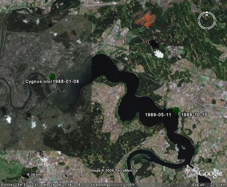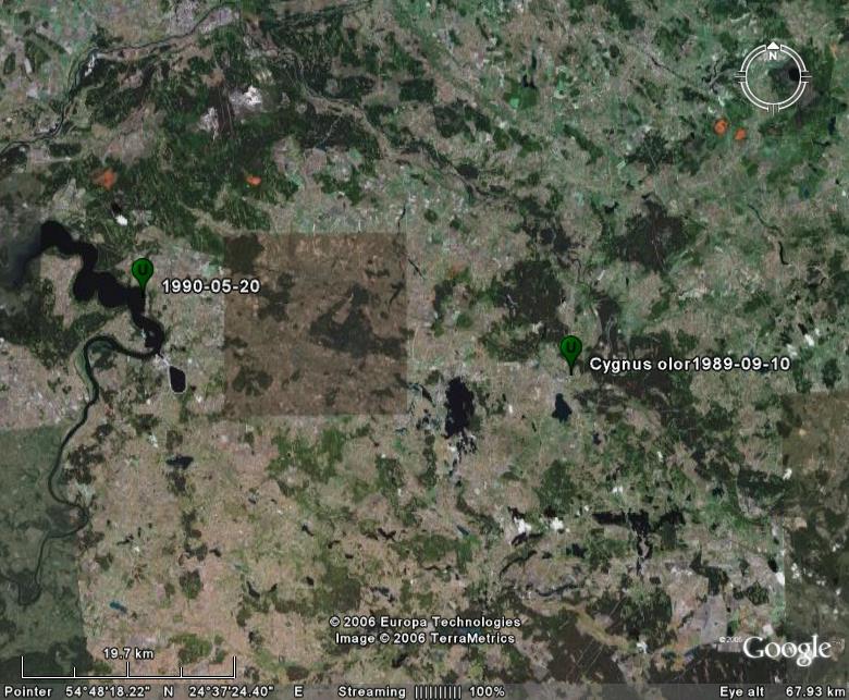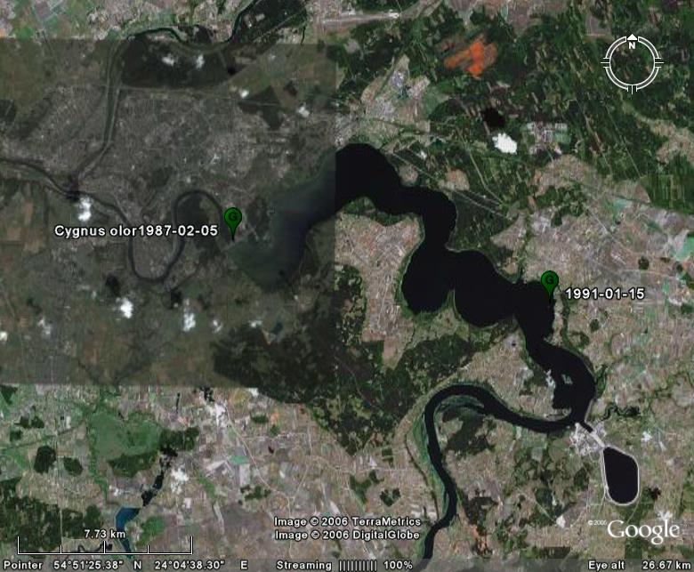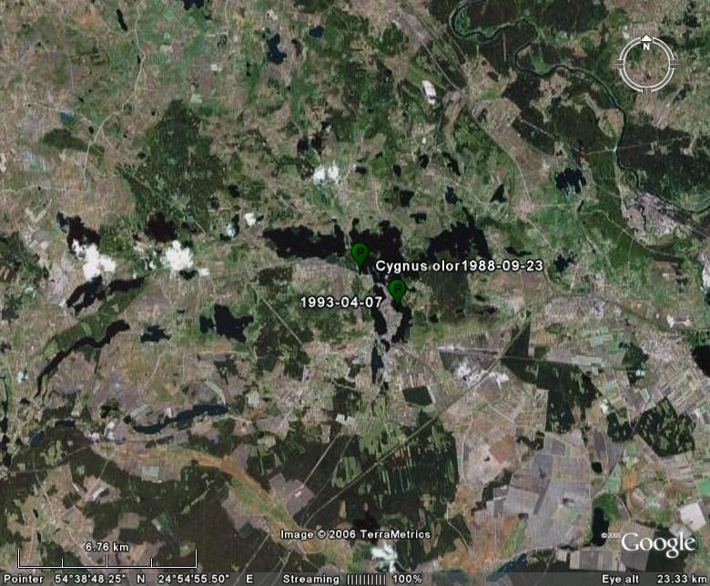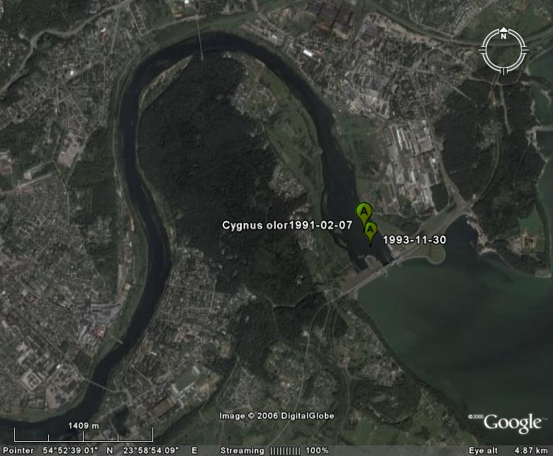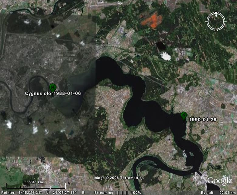 | Cygnus olor | 9956 | 1991 03 24 | Rumšiškės, Kaišiadorys | <1990 | 1993 02 04 | Marijampolė | Lietuva | Gyvas | 683 | 66 | |