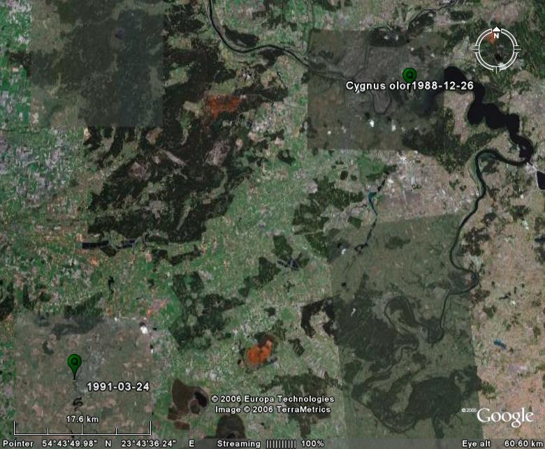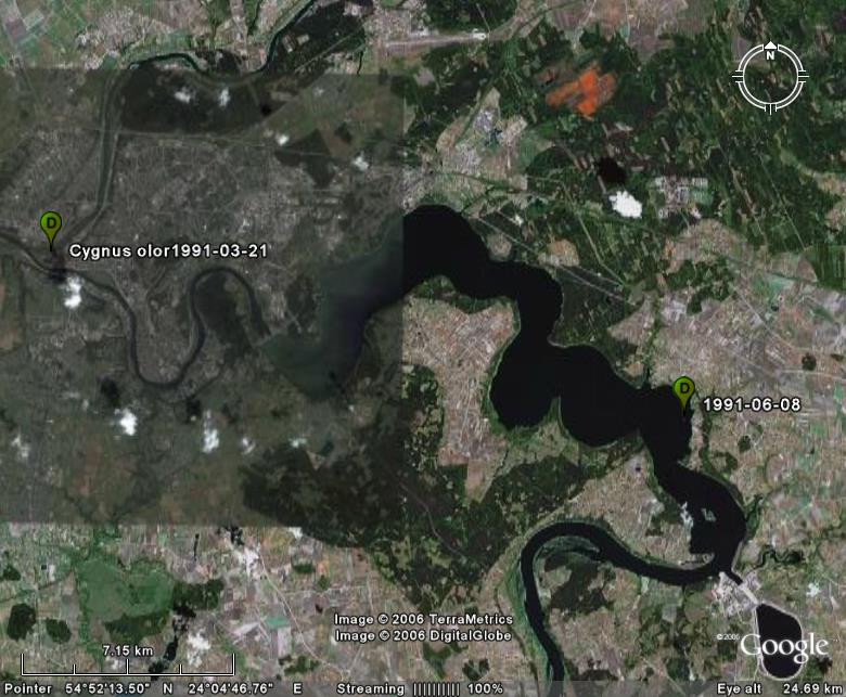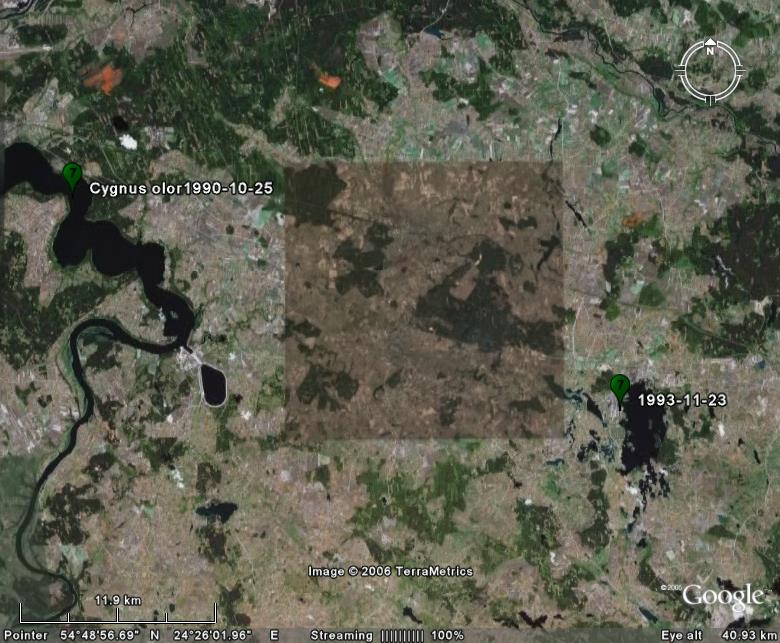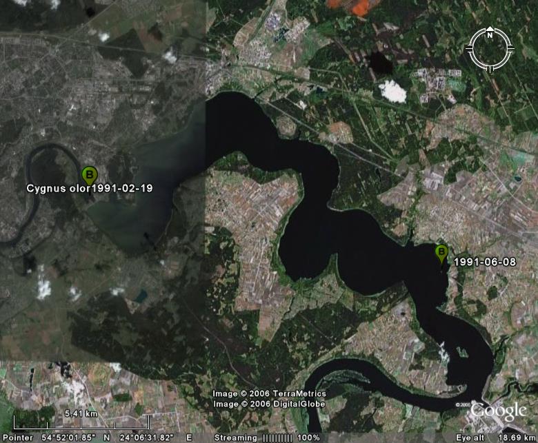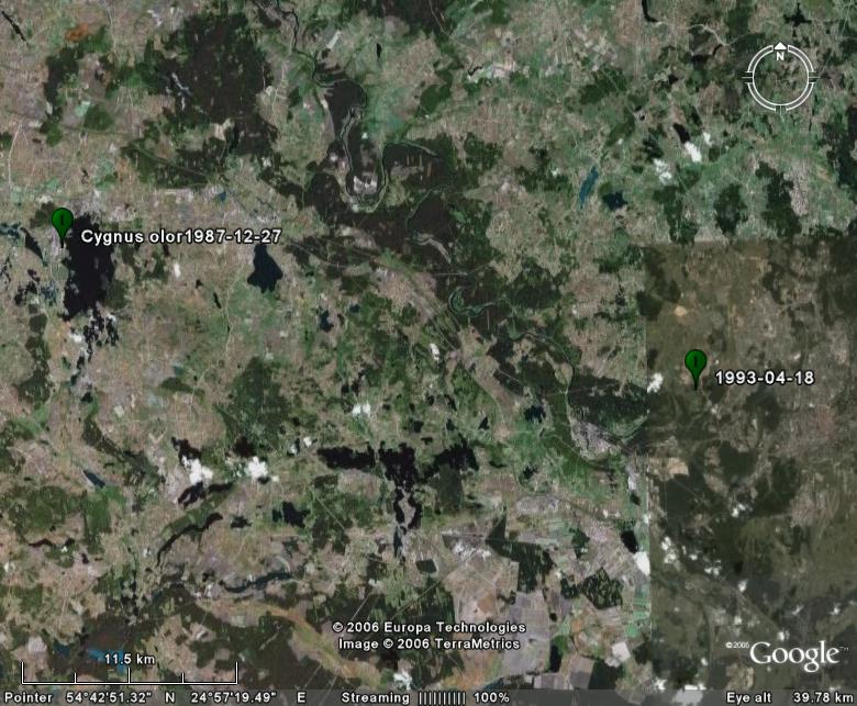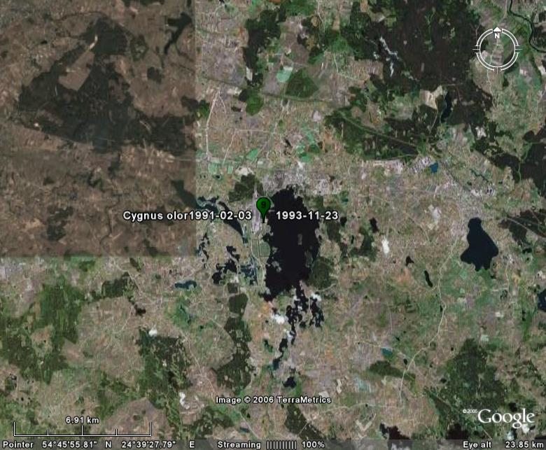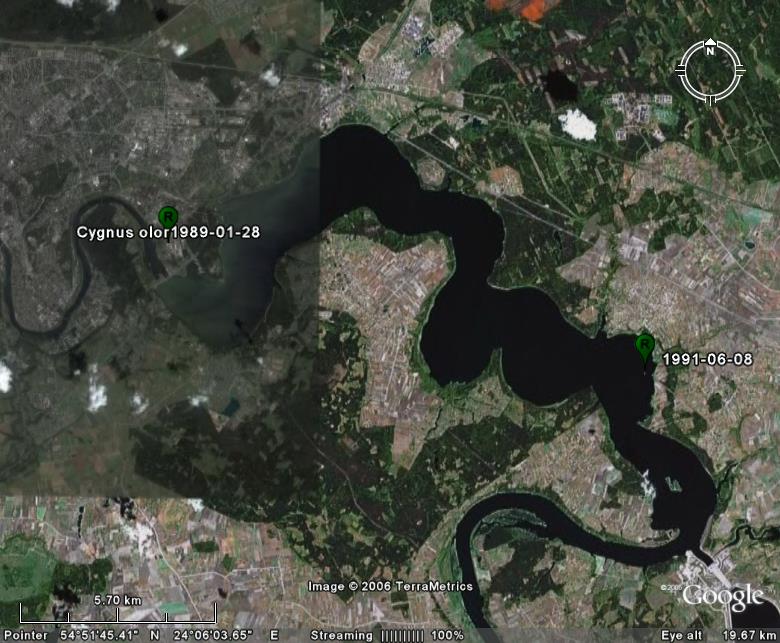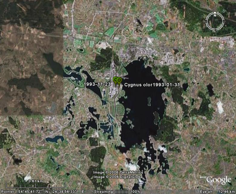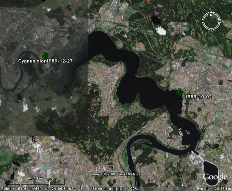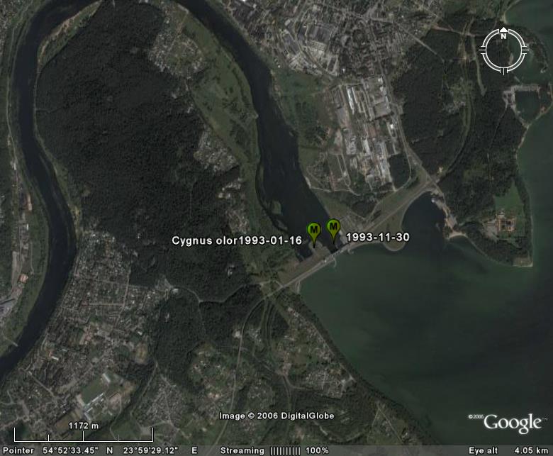 | Cygnus olor | 9956 | 1991 03 24 | Rumšiškės, Kaišiadorys | <1990 | 1993 02 04 | Marijampolė | Lietuva | Gyvas | 683 | 66 | |