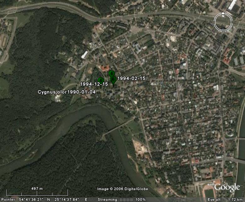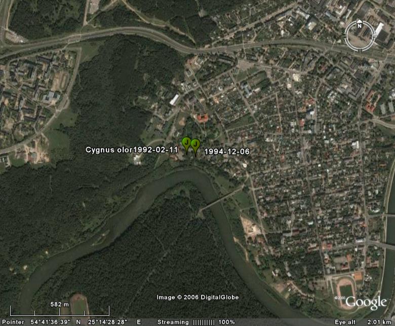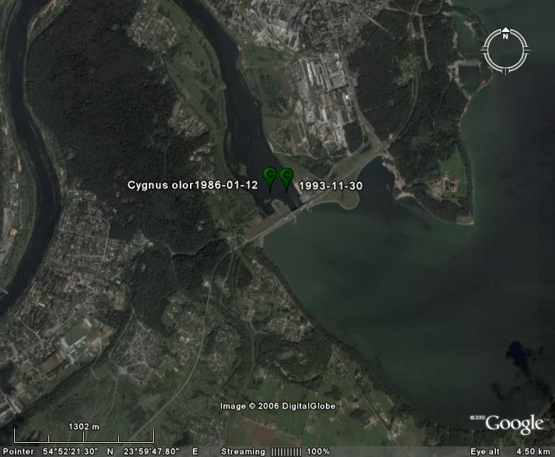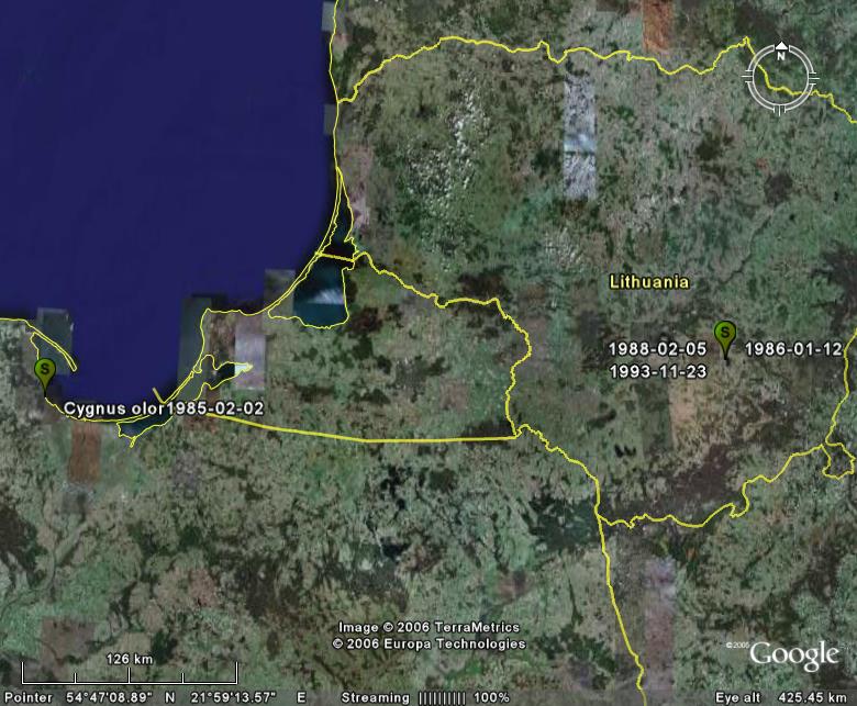 | Cygnus olor | 1A 124 | 1993 11 30 | Kaunas | F | <1993 | 1994 02 19 | Kaunas | Lietuva | Gyvas | 81 | 0 |