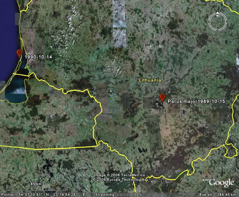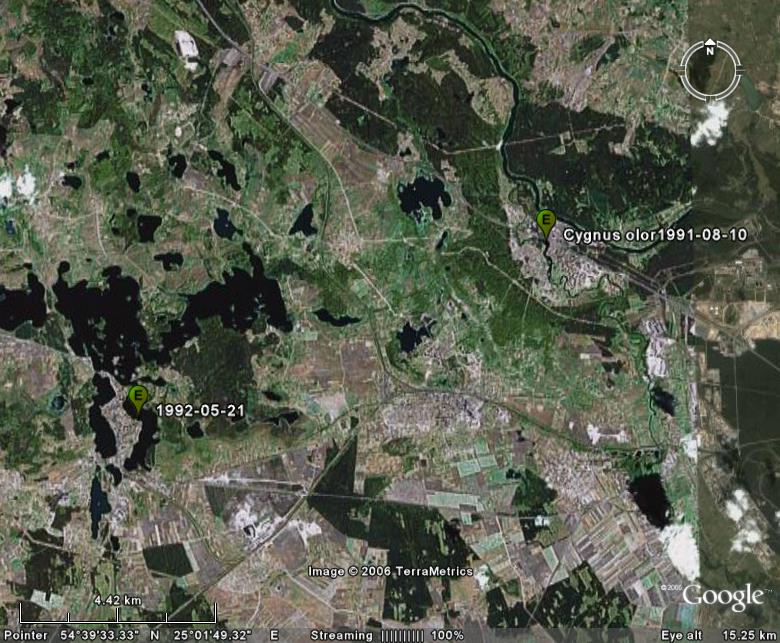 | Cygnus olor | 9125 | 1990 06 16 | Palomenė, Kaišiadorys | F | <1990 | 1991 09 19 | Zickersee, Ruegen, Rostock | Vokietija | Gyvas | 460 | 690 |