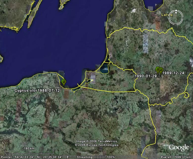 | Cygnus olor | 1A 143 | 1992 05 21 | Trakai | F | 1991 | 1992 09 11 | Rybacyj, Kaliningrad | Rusija | Sergantis, nepaleistas | 113 | 275 |