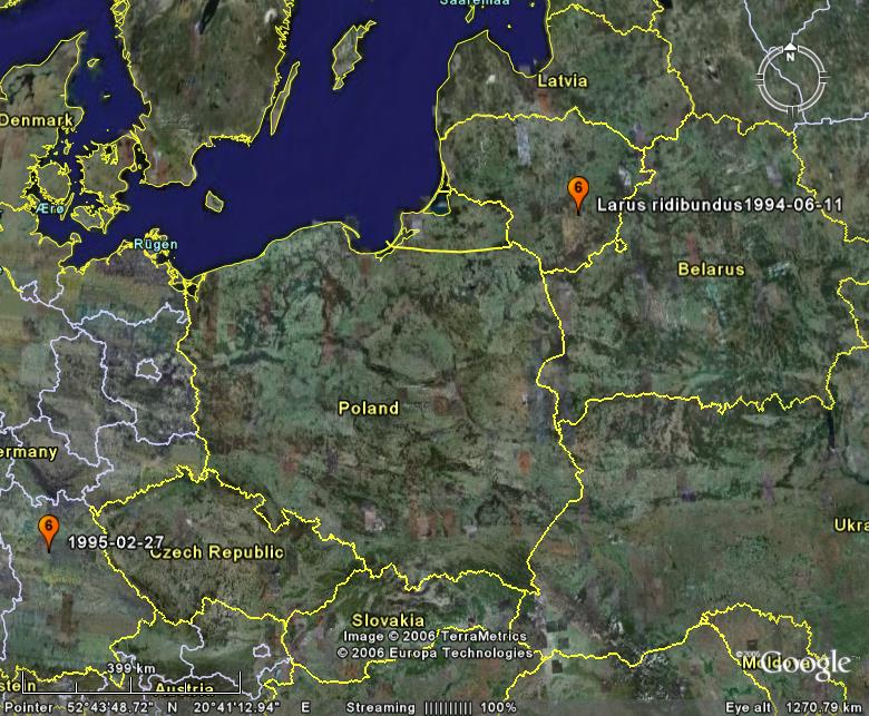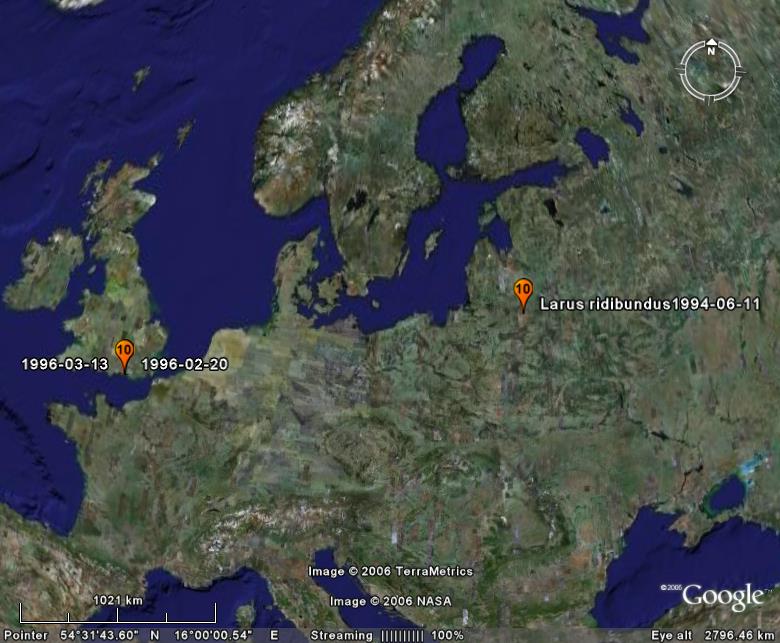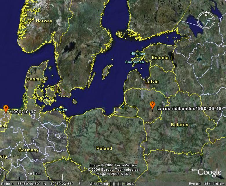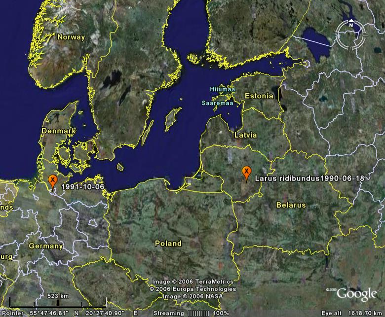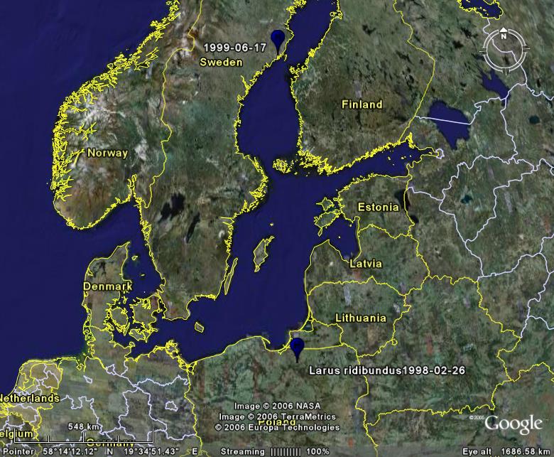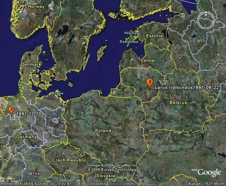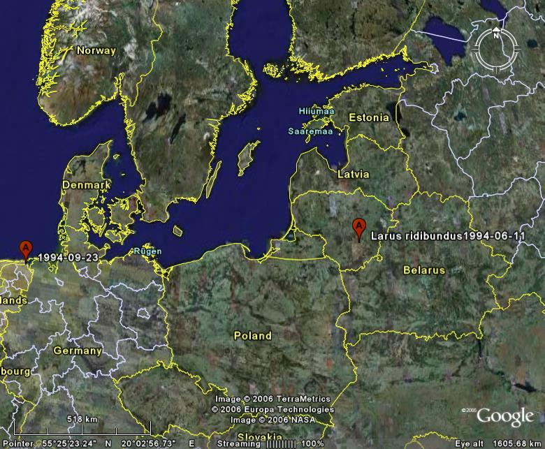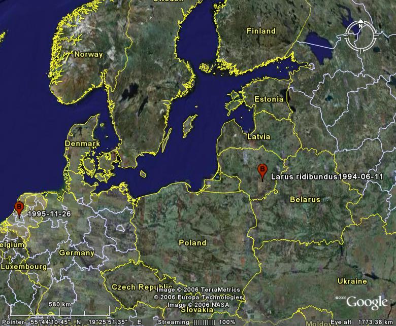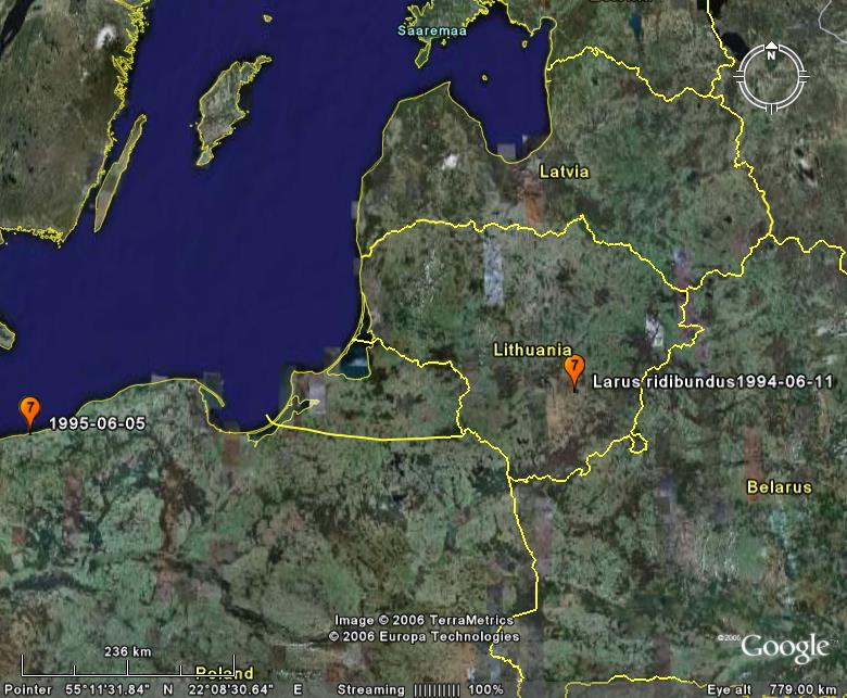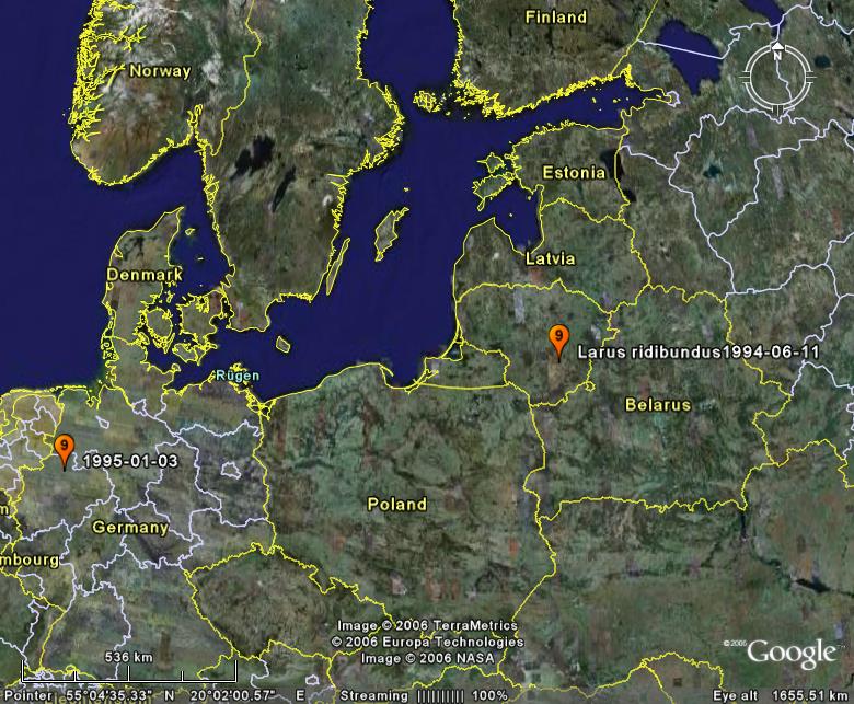 | Larus ridibundus | FN09661 | 1998 02 26 | Swinoujscie, Szczecin, Lenkija | F | <1997 | 1999 06 17 | Lasarettsdammen, Umeå, Västerboten | Švedija | Gyvas | 476 | 1154 |