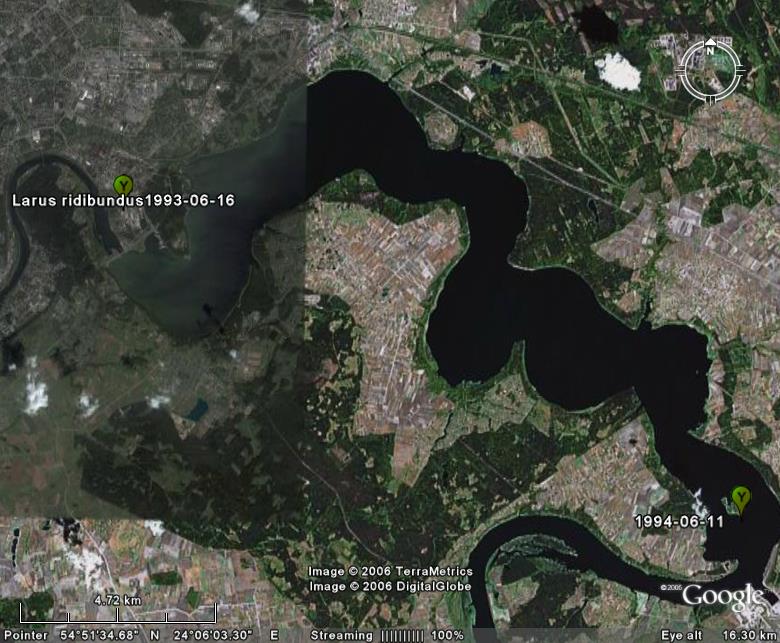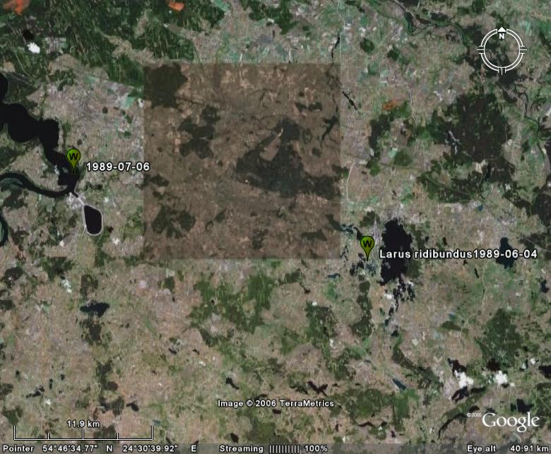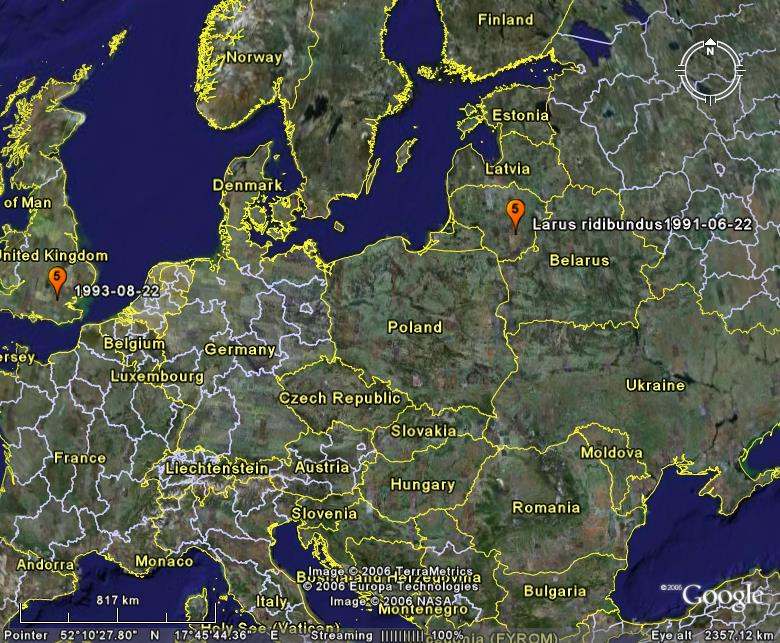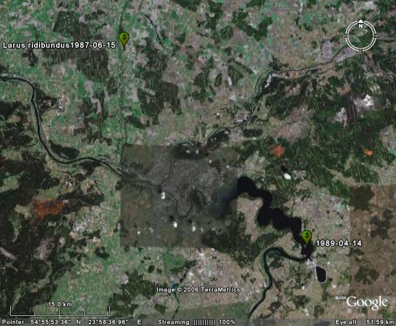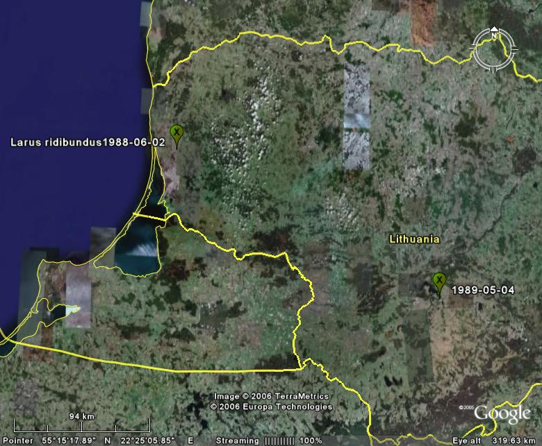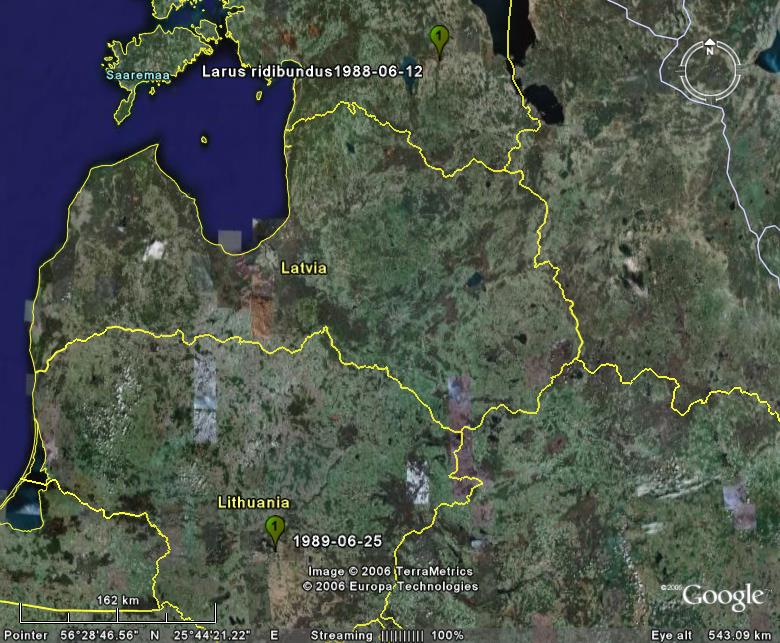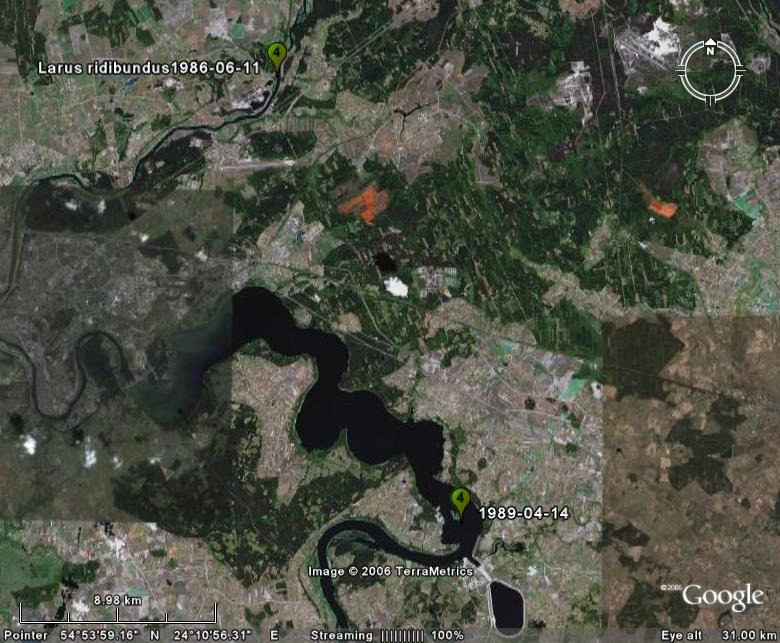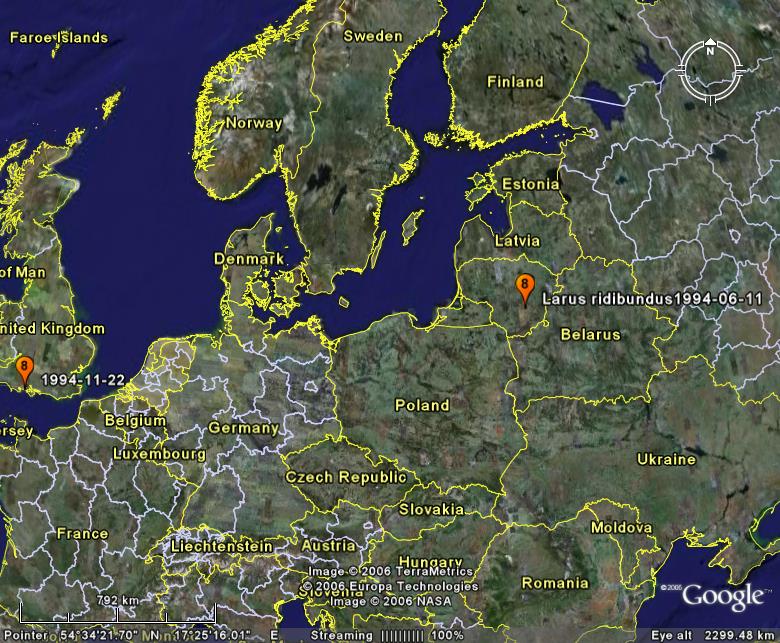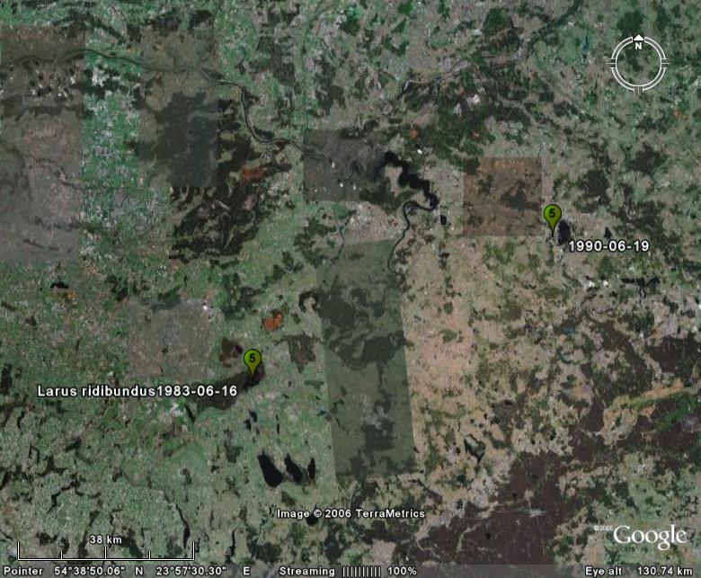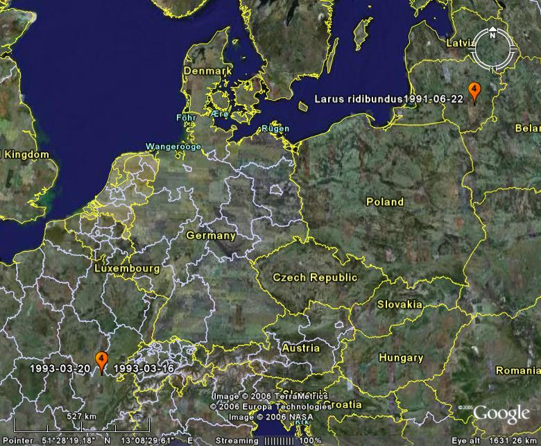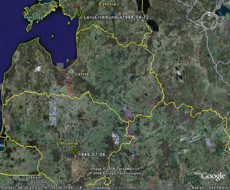| Larus ridibundus | FN09661 | 1998 02 26 | Swinoujscie, Szczecin, Lenkija | F | <1997 | 1999 06 17 | Lasarettsdammen, Umeå, Västerboten | Švedija | Gyvas | 476 | 1154 |