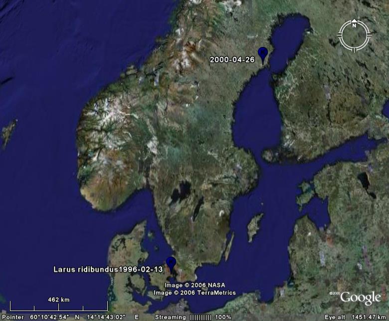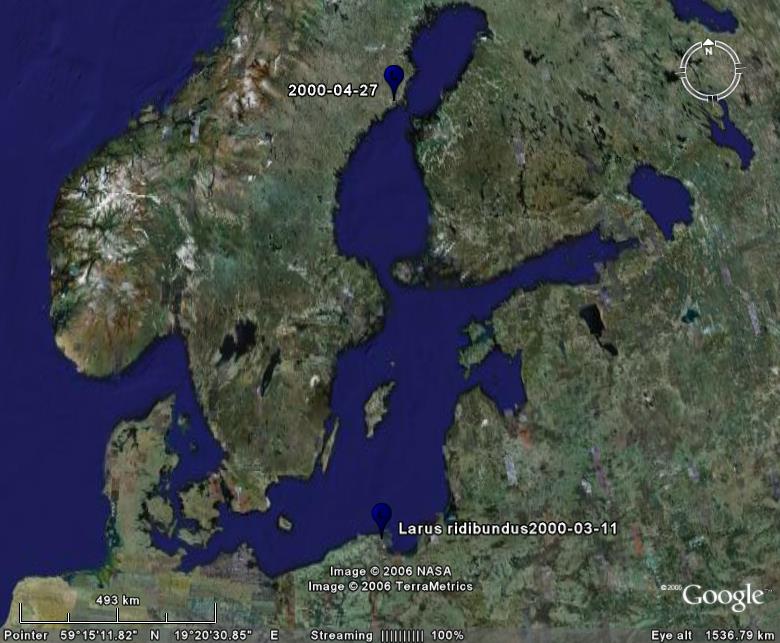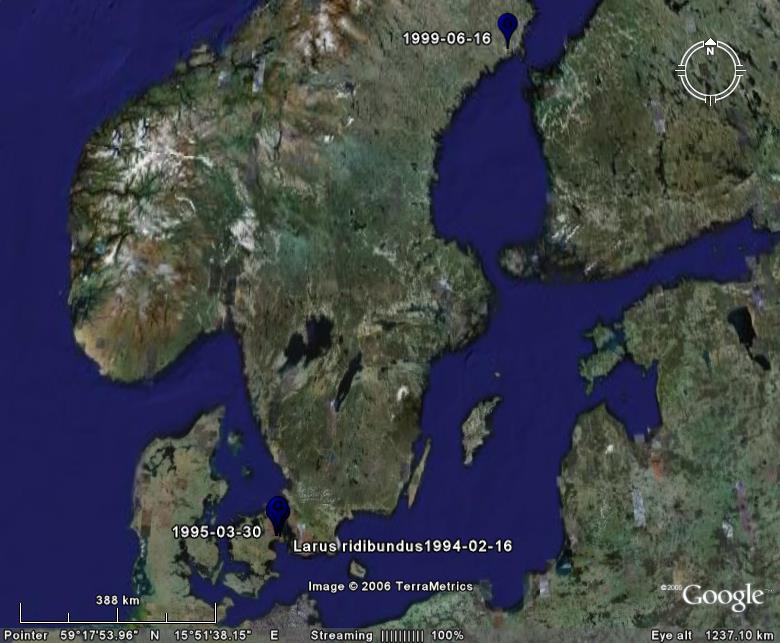 | Larus ridibundus | 6164438 | 1997 07 02 | Sladan, Piteå, Norrbotten, Švedija | PULL | 2000 04 27 | Lasarettsdammen, Umeå, Västerboten | Švedija | Gyvas | 1030 | 188 | |