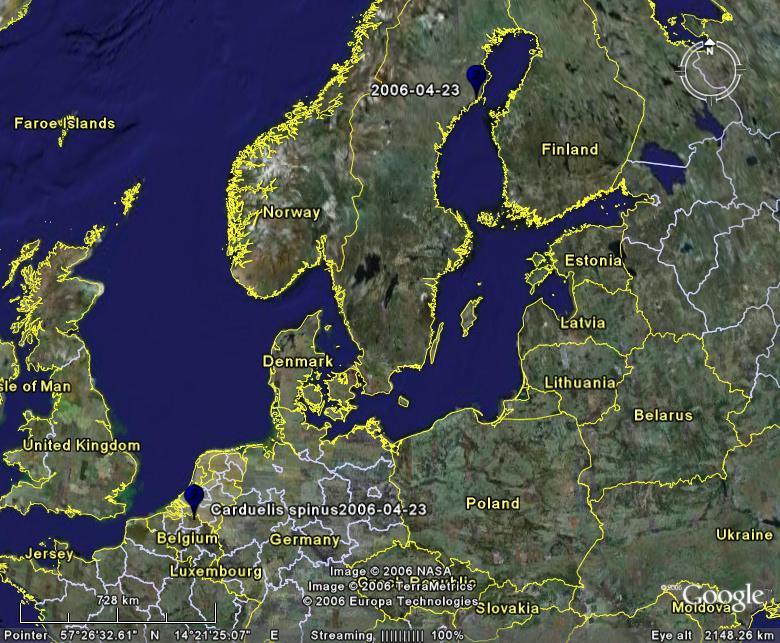 | Carduelis spinus | 9361909 | 2006 04 23 | Vosselaar, Antwerpen, Belgija | M | 2+ | 2006 04 23 | Umeå | Švedija | Gyvas | 36 | 1653 |