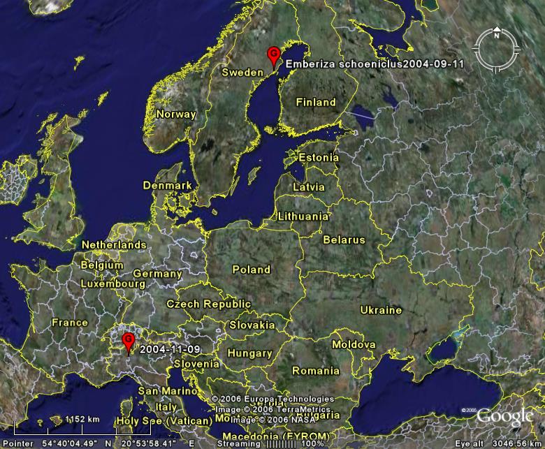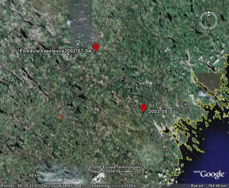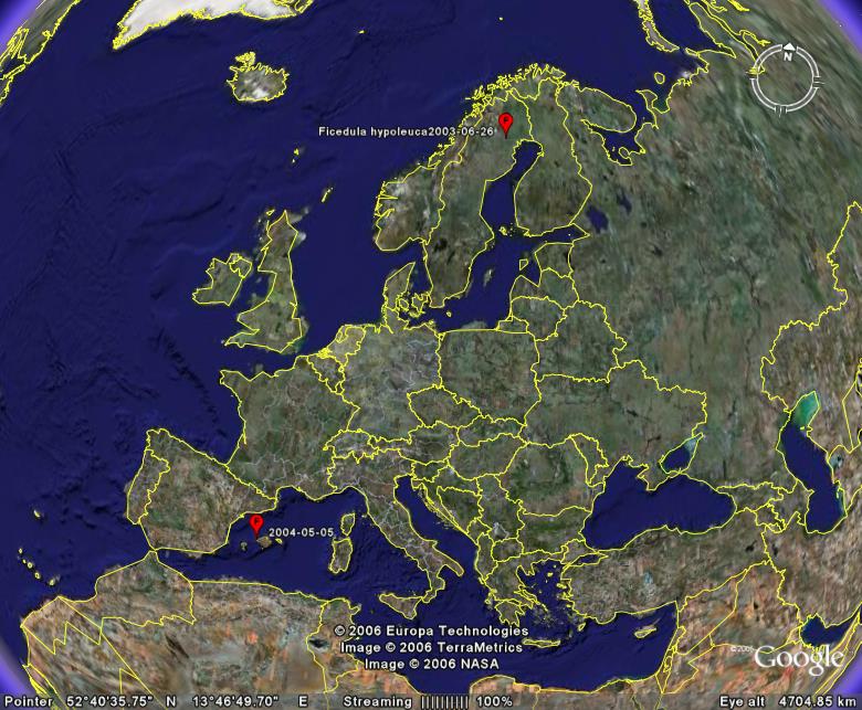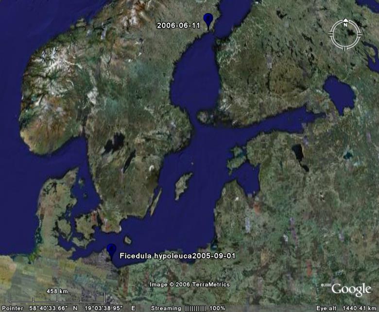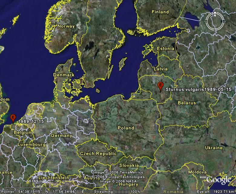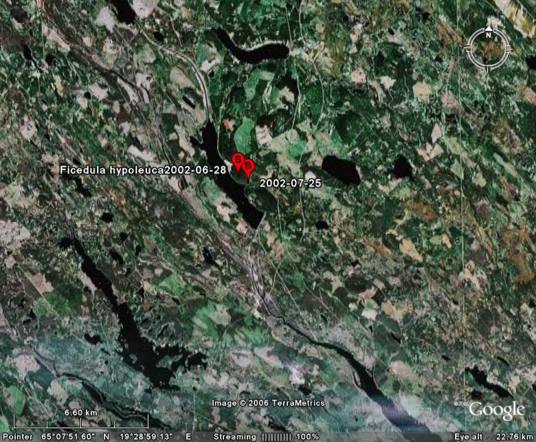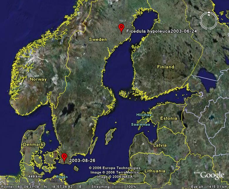 | Ficedula hypoleuca | XU 5..6 | 2005 09 01 | Greifswalder Oie, Rostock, Vokietija | F | 10 | 2006 06 11 | Tomtebo, Umeå, Västerboten | Švedija | Peri | 1126 | 283 |