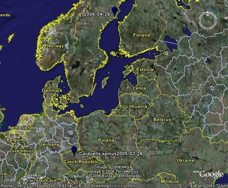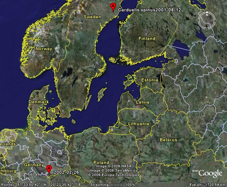 | Carduelis spinus | S 800509 | 2005 02 26 | Stara Boleslav, Praha, Čekija | M | 2+ | 2006 04 29 | Tomtebo, Umeå, Västerboten | Švedija | Gyvas | 1552 | 427 |