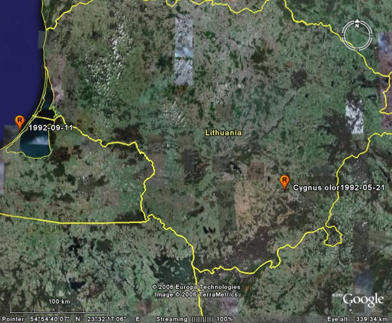 | Cygnus olor | 9140 | 1990 05 23 | Rumšiškės, Kaišiadorys | <1990 | 1990 12 31 | Klaipėda | Lietuva | Gyvas | 222 | 218 | |