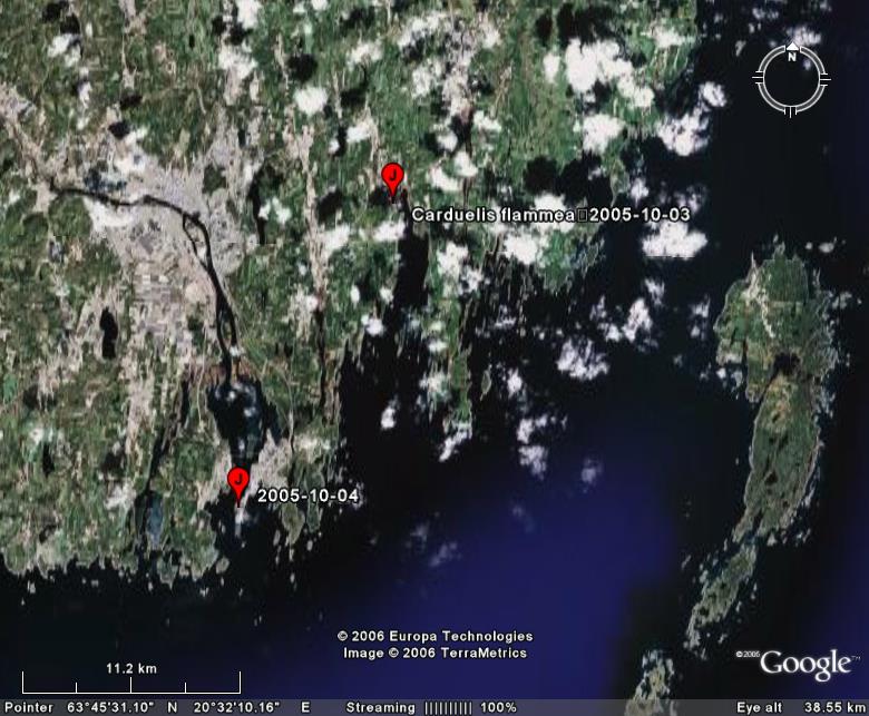 | Carduelis chloris | 2KK89093 | 2004 05 27 | Fabriksviken, Hörnefors, Västerboten, Švedija | M | <2002 | 2004 06 01 | Carlshem, Umeå, Västerboten | Švedija | Gyvas | 5 | 30 |
