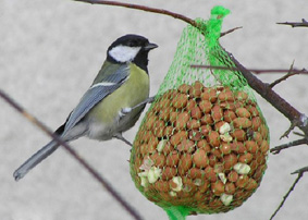 Pats paprasčiausias būdas pateikti paukščiams lesalą - supilti jį į tinklelio maišelį. Taip patalpinus suformuotą "paukščių pyragą" (kaip jį pasigaminti, skaitykite skyrelyje Lesinimui naudojami produktai), supylus žemės ar lazdyno riešutus, atvirasis galas užrišamas ir šis maišelis paprasčiausiai pakabinamas ant medžio šakos arba krūme (1 pav.).
