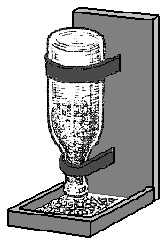 Jei nėra galimybės nuolat prižiūrėti lesyklų, be tiesiog pakabintų lašinių ir į tinklelius sudėtų produktų ar paukščių pyrago, labai patogu naudoti dozuojančias lesyklas. Tik tegul jūsų neišgąsdina toks lesyklų pavadinimas - tai nėra labai sudėtingų konstrukcijų lesyklos ir jas galima nesunkiai pasigaminti patiems. Vieną tokį pavyzdį jau minėjome, aprašydami paprasto plastikinio butelio pritaikymą (2 pav.). Dozuojančiomis šios lesyklos vadinamos todėl, kad turi specialią talpyklą, į kurią suberiamas didesnis, nei įprastai, lesalo kiekis. Nors šių lesyklų yra įvairių formų, jos visos gaminamos taip, kad veikiamas sunkio jėgos lesalas pro angą iš šios talpyklos byra į platformą, bet tik tuomet, kai paukščiai sulesa ten esantį, ir tik tol, kol platformoje yra laisvos vietos. Todėl jas gaminti reikia taip, kad talpyklos anga arba tarpas nuo jos iki platformos nebūtų per dideli. Talpyklos gali būti įvairių formų: piltuvo formos su visomis į apačią siaurėjančiomis sienelėmis, su dviem siaurėjančiomis į apačią sienelėmis (5 pav.), dėžutės formos, kurios tik apatinė dalis susiaurėja, su viena statmena sienele, o priešinga jai kiek įstriža ir t.t. Be abejo, tokia talpykla gali būti ir plastikinis butelis.